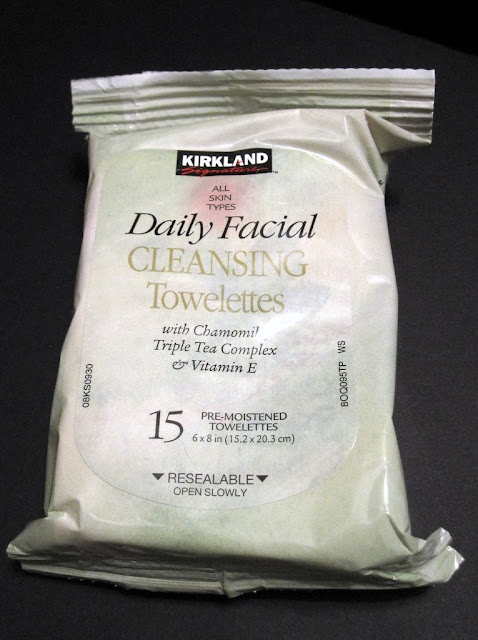 My current favorites are Kirkland's Daily Facial Cleansing Towelettes. These are from Costco, of course, so I split a box of these with my bff (you will find I mention her a lot...). I think we each got a big pack or two and a smaller travel-sized one with fewer wipes too (pictured below).